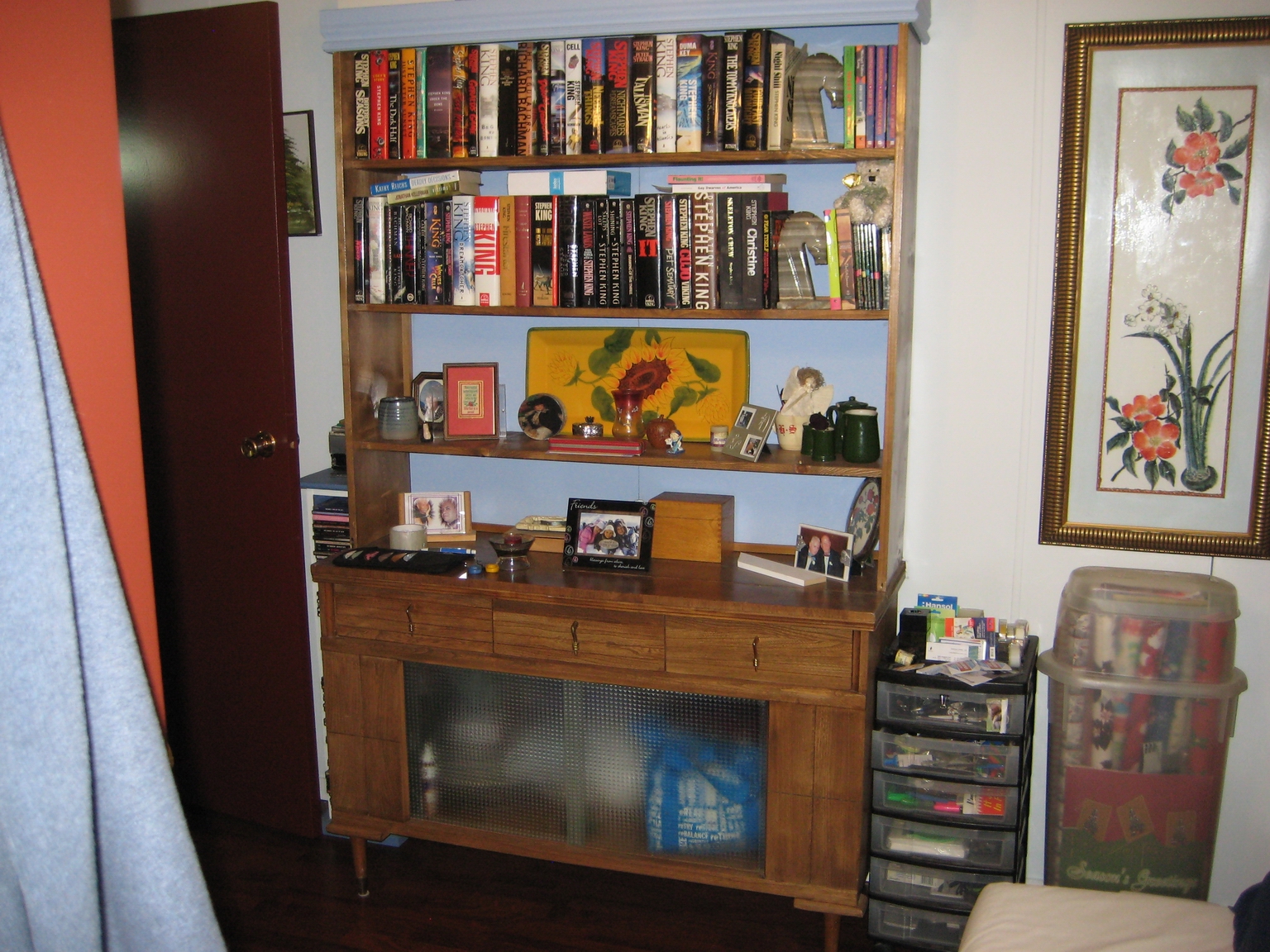 Our dining room hutch which is now my Stephen King collection display and Alex’s Craft centre….