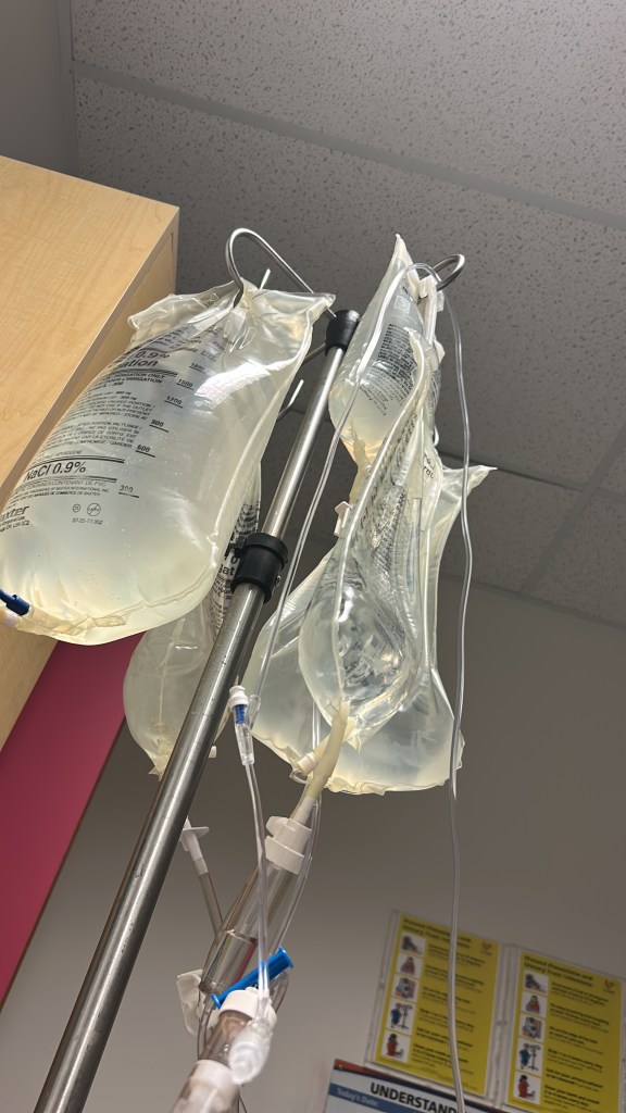 I was then admitted to the hospital and I was taken up to a semi-private room. There, I was given more painkillers, hooked up to an IV Station on my right hand, had another IV tube inserted on my left shoulder and finally had a catheter inserted to help drain my bladder.
