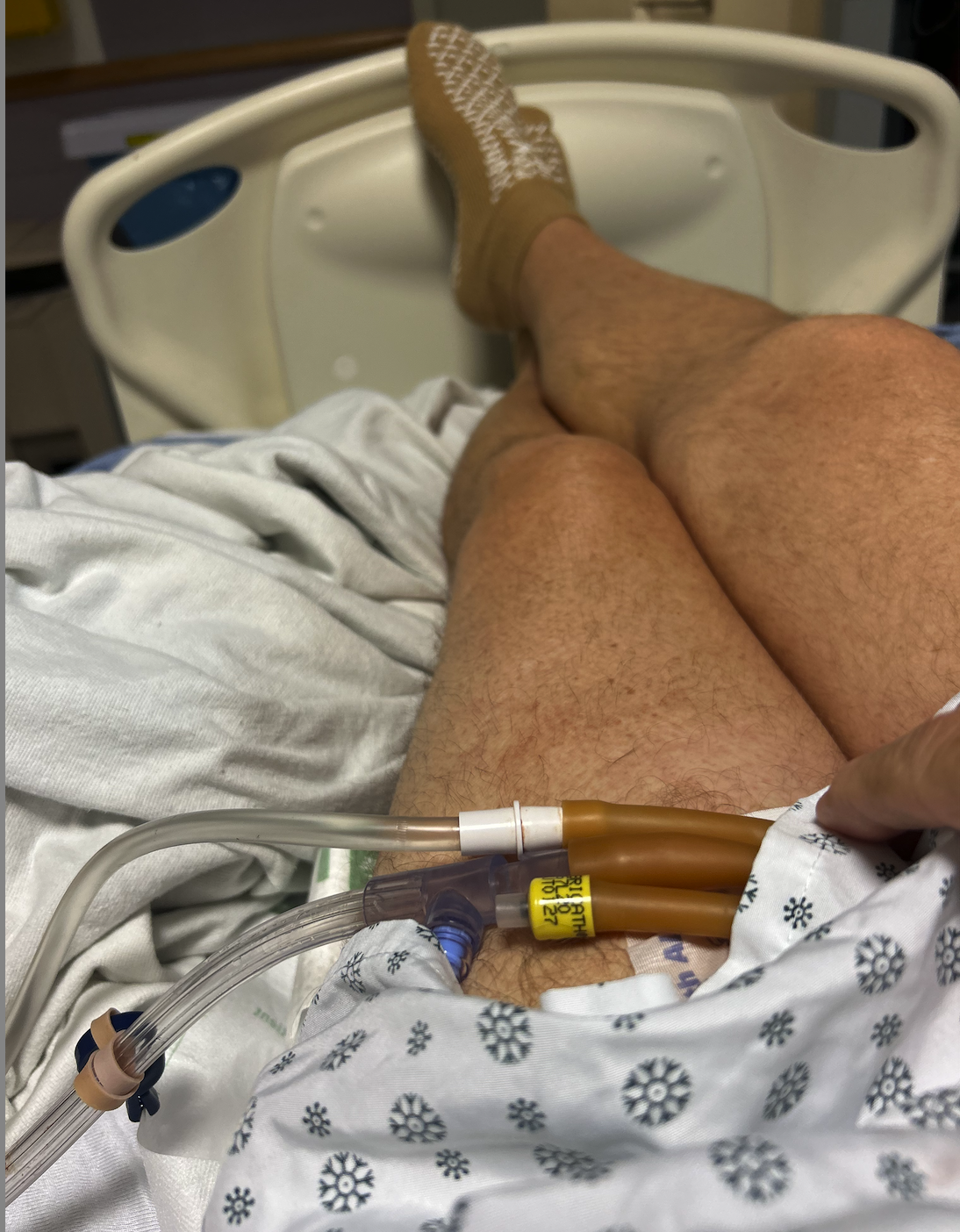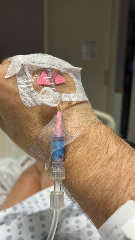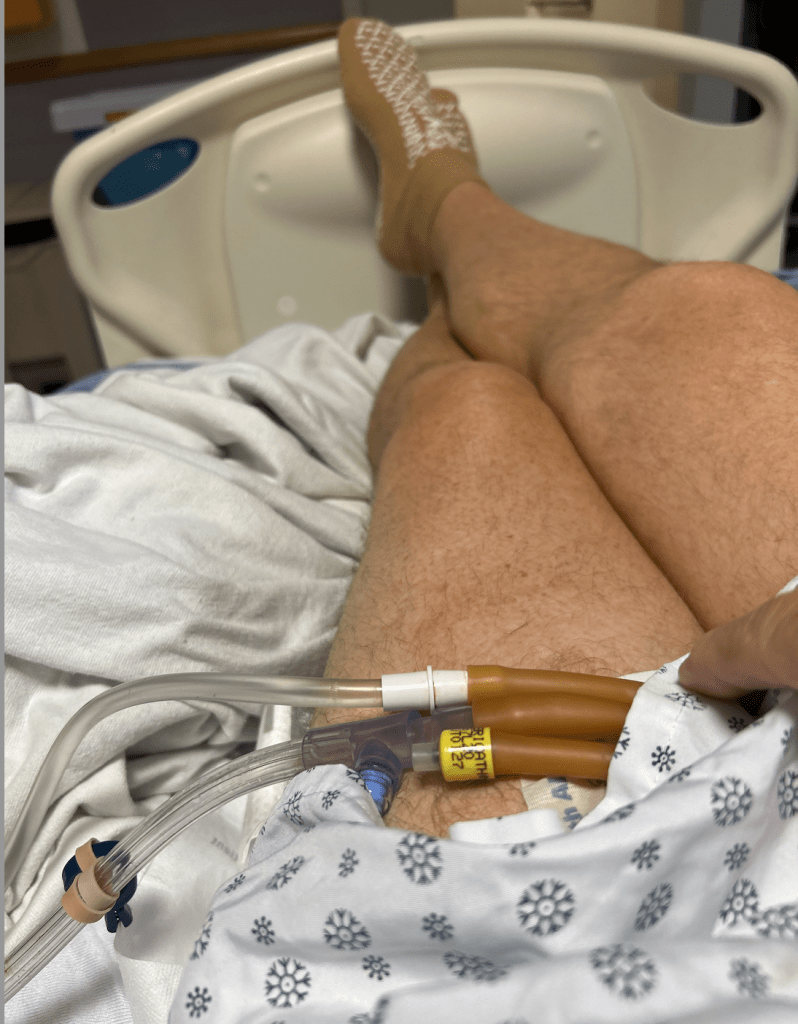 Wednesday, July 30. At this point, my phone was about to die. I did manage to connect with Debbi, who came down with a cellphone charger for me. That was my lifeline for the next 4 days. I was still being filled with IV Fluids. The fluids were pumped in me, draining through the catheter inside me. But, when the clots became too big, the nursing staff were forced to flush me (see above – *shudder). It was at this point that I began begging the staff to give me something to sleep. They weren’t allowed to do that without authorization from my doctor. They weren’t able to reach him.