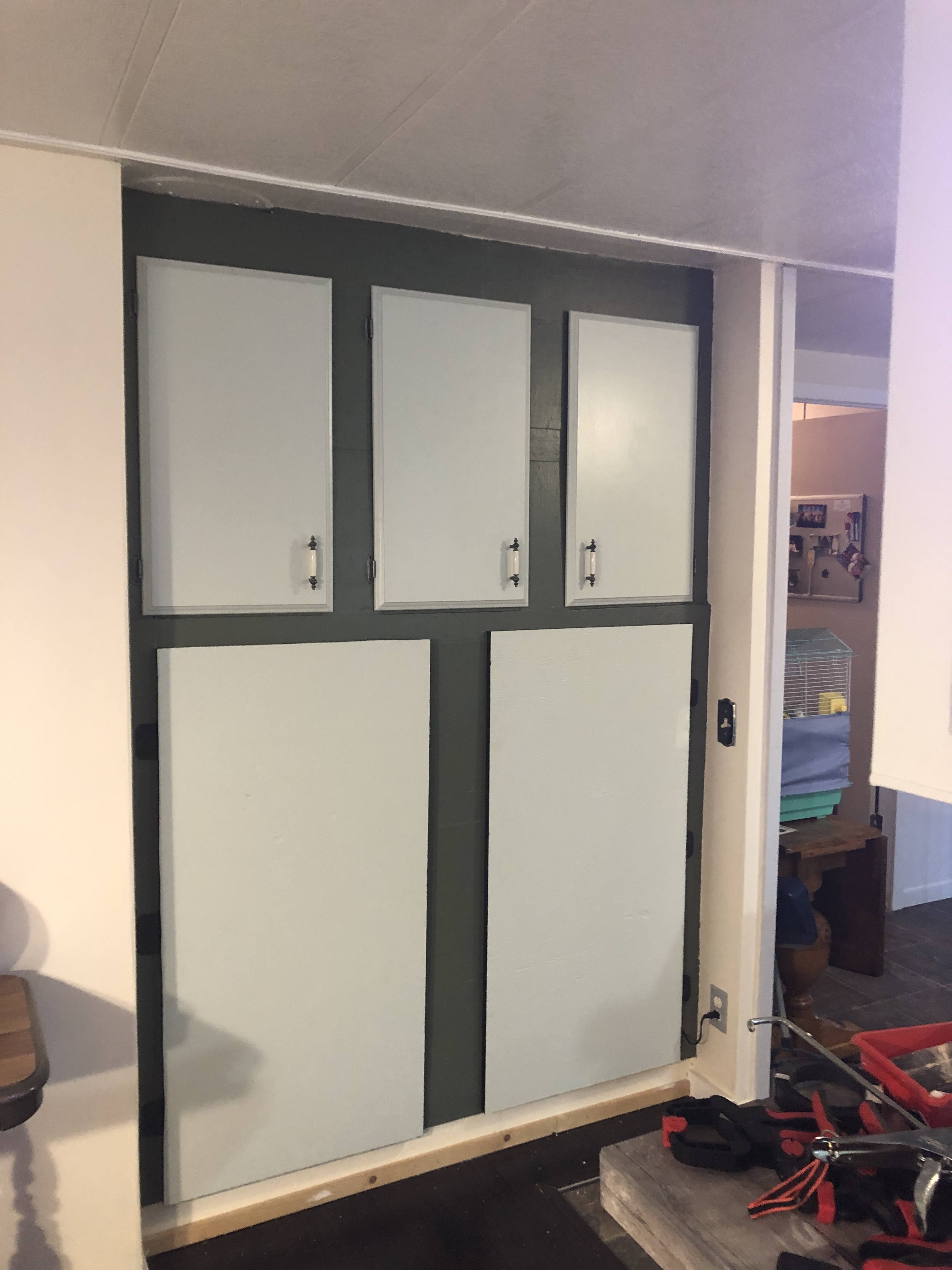 We invested in a couple of cabinets to put in there but, we grew tired of those, too. So, when Alex started working on the kitchen, he decided that it was time to make a built in cabinet