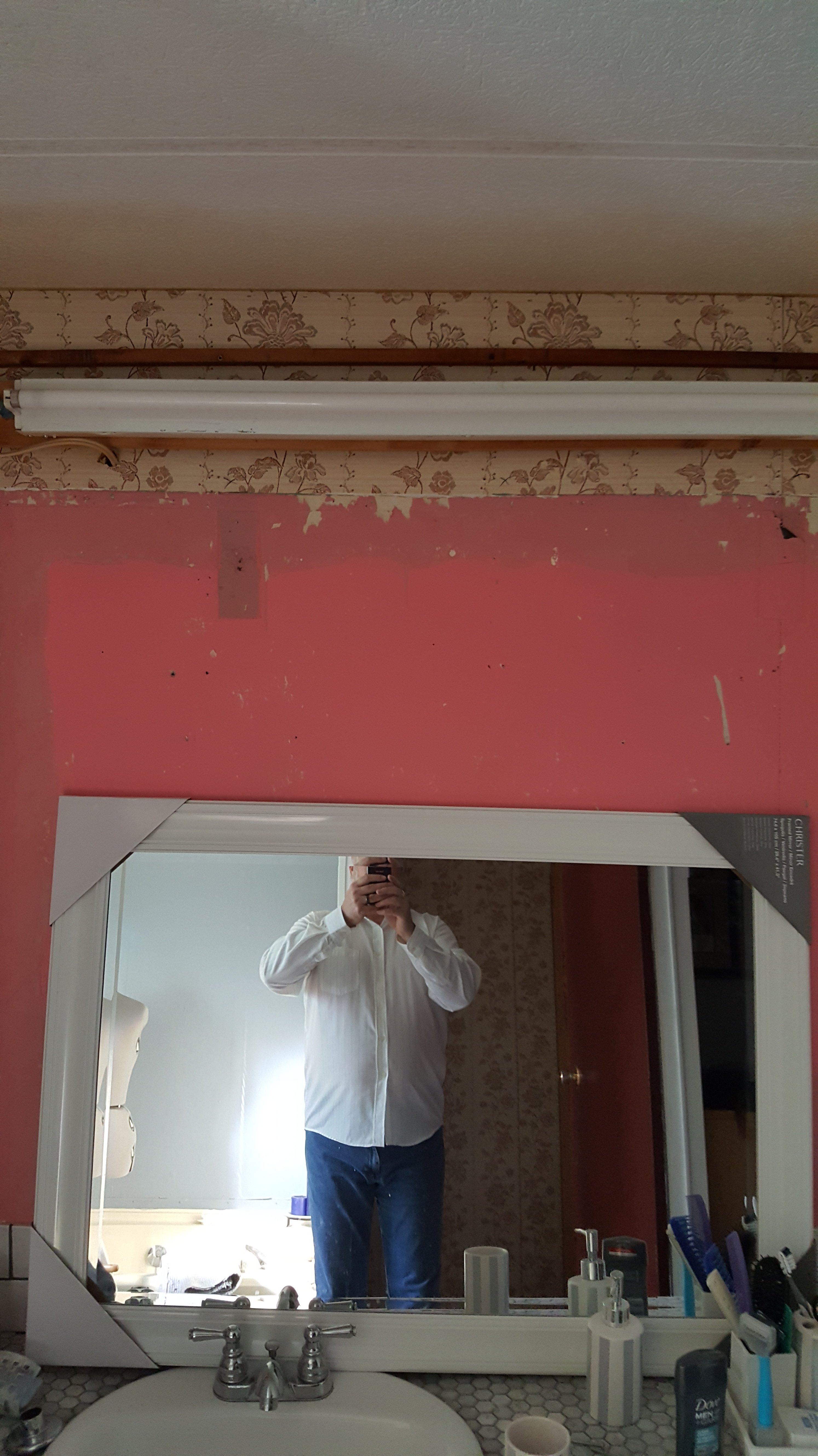 Alex ripped out the lighting valance over the vanity and pulled the medicine cabinet down earlier this week. He also managed to remove 7 layers of wallpaper.
