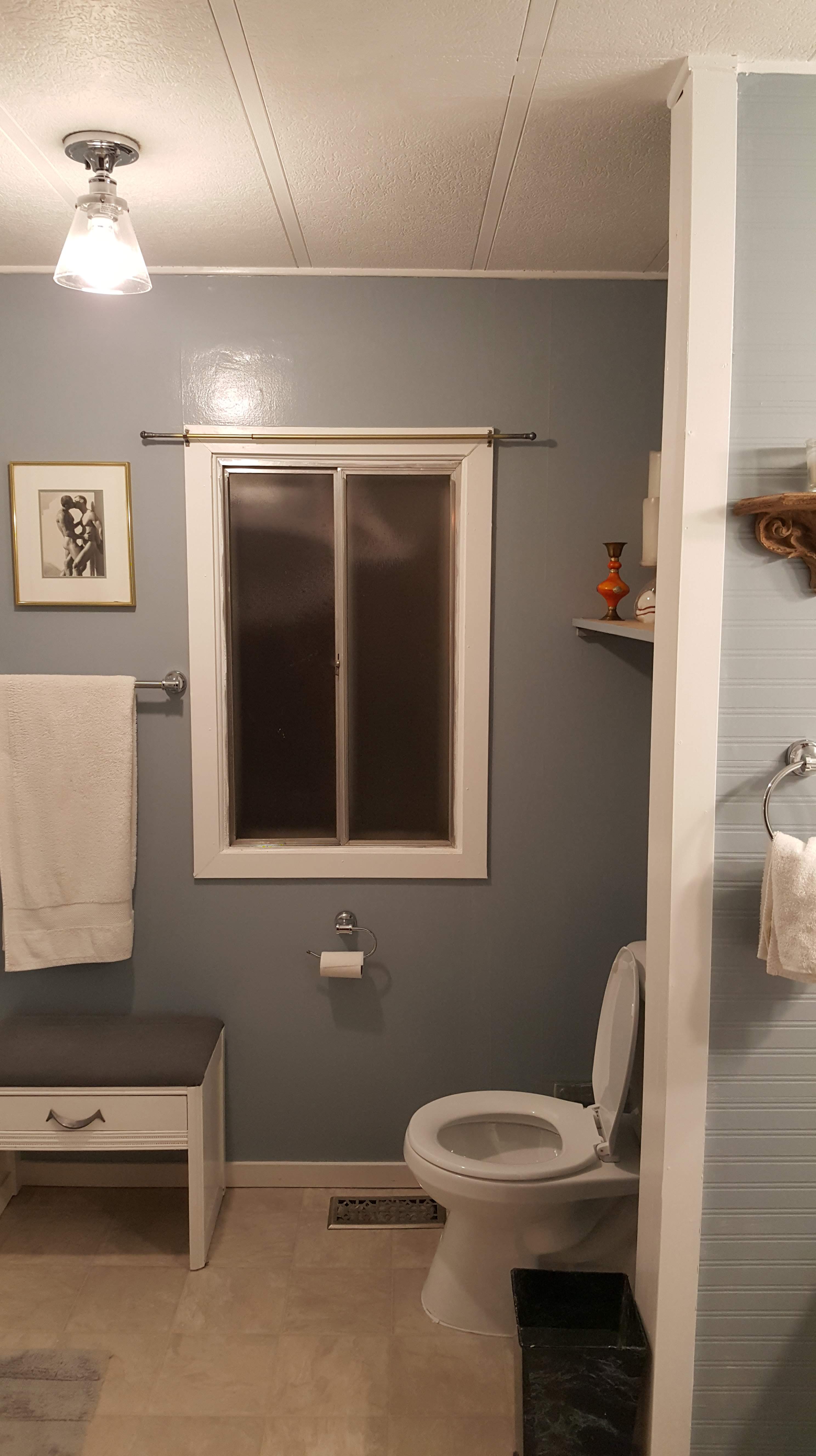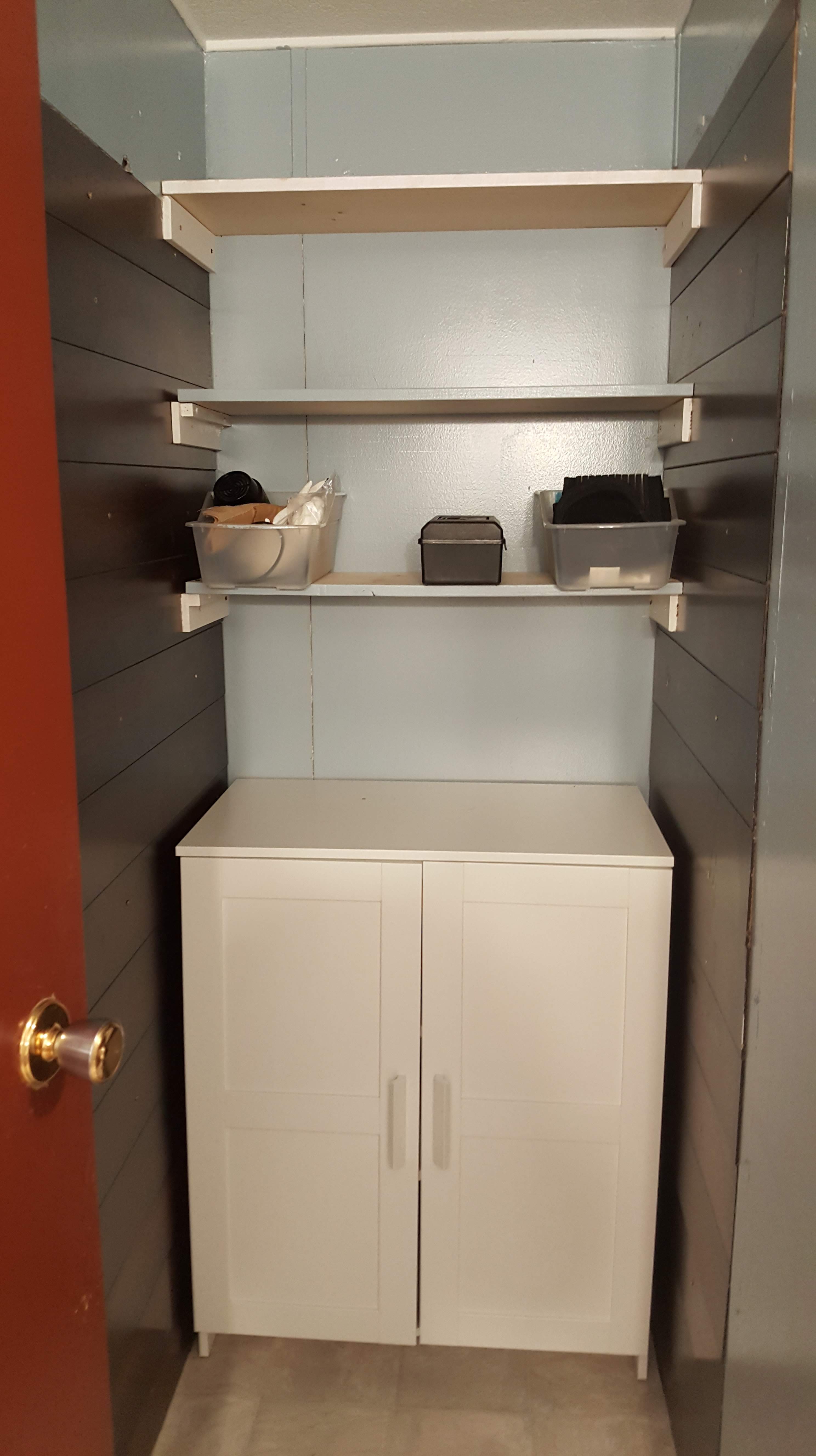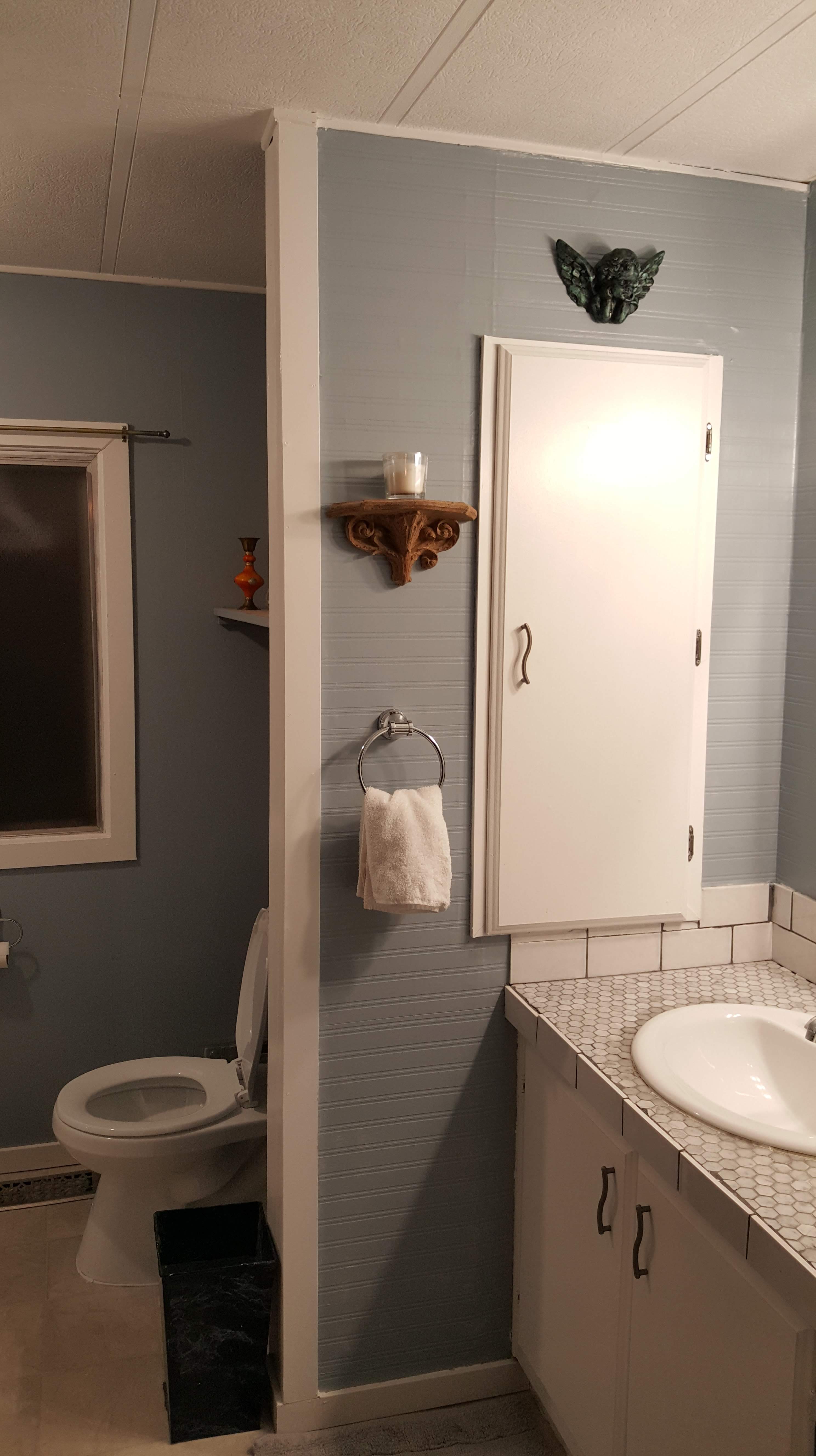 The new vanityNew paint and new toilet – it rocks!The walk in shower of my dreams!A new storage area where the shower used to be. Alex did a great job filling it in with practical and functional ideasEven Phantom likes it