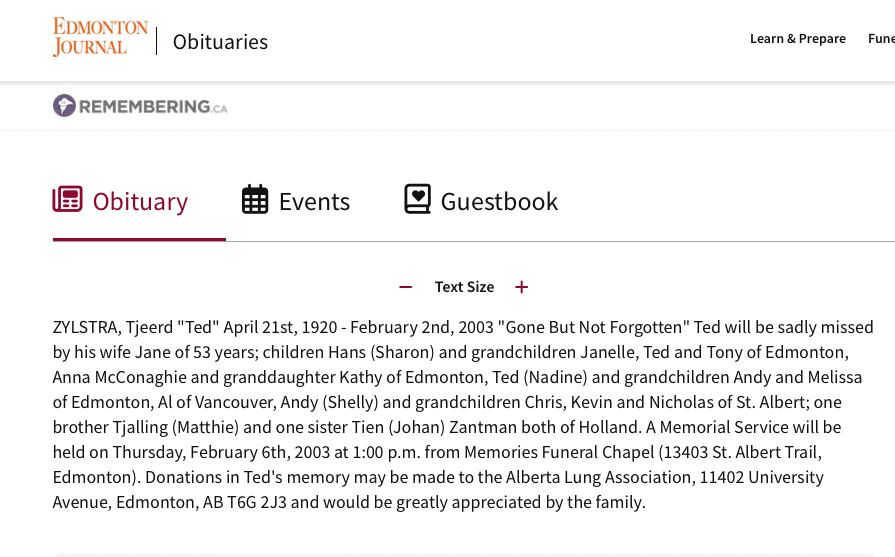 He was admitted to the Misericordia Hospital in Edmonton about three days before he passed away. I was able to see him the evening before he died. He was in a coma. He looked so frail. My whole family was there when I got to his room. I held his hand and whispered to him that I was there and if he needed to go, he should. I hoped that he heard me. After a few hours, everyone left – my older brother took my mom home – she, herself was recovering from cancer surgery. The last person to leave was my sister, Anna.